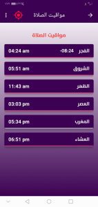 كذلك يمكنك أيضًا معرفة أوقات كل صلاة ، بدءًا من صلاة الفجر و كذلك صلاة الظهر و كذلك صلاة العصر و كذلك صلاة المغرب و كذلك صلاة العشاء. كما يتيح لك التطبيق كذلك التحكم الإلكتروني الكامل في الأذان مع إمكانية إغلاق الأذان بشكل كامل للتطبيق.